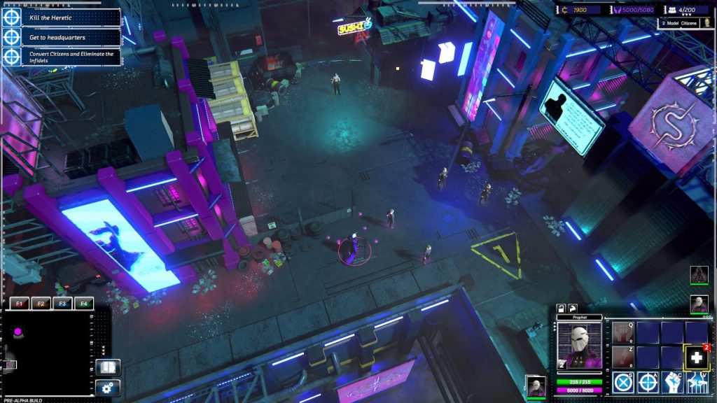 The game takes place in the isometric future of 2083. The population is becoming increasingly disenfranchised with the mega corporations and advanced technology that dominate the world. Players take on the role of a Prophet leading their own cult of believers. Once converted, you can upgrade your cultists to fill the role of specific units. This helps them better spread your neon-futuristic gospel.