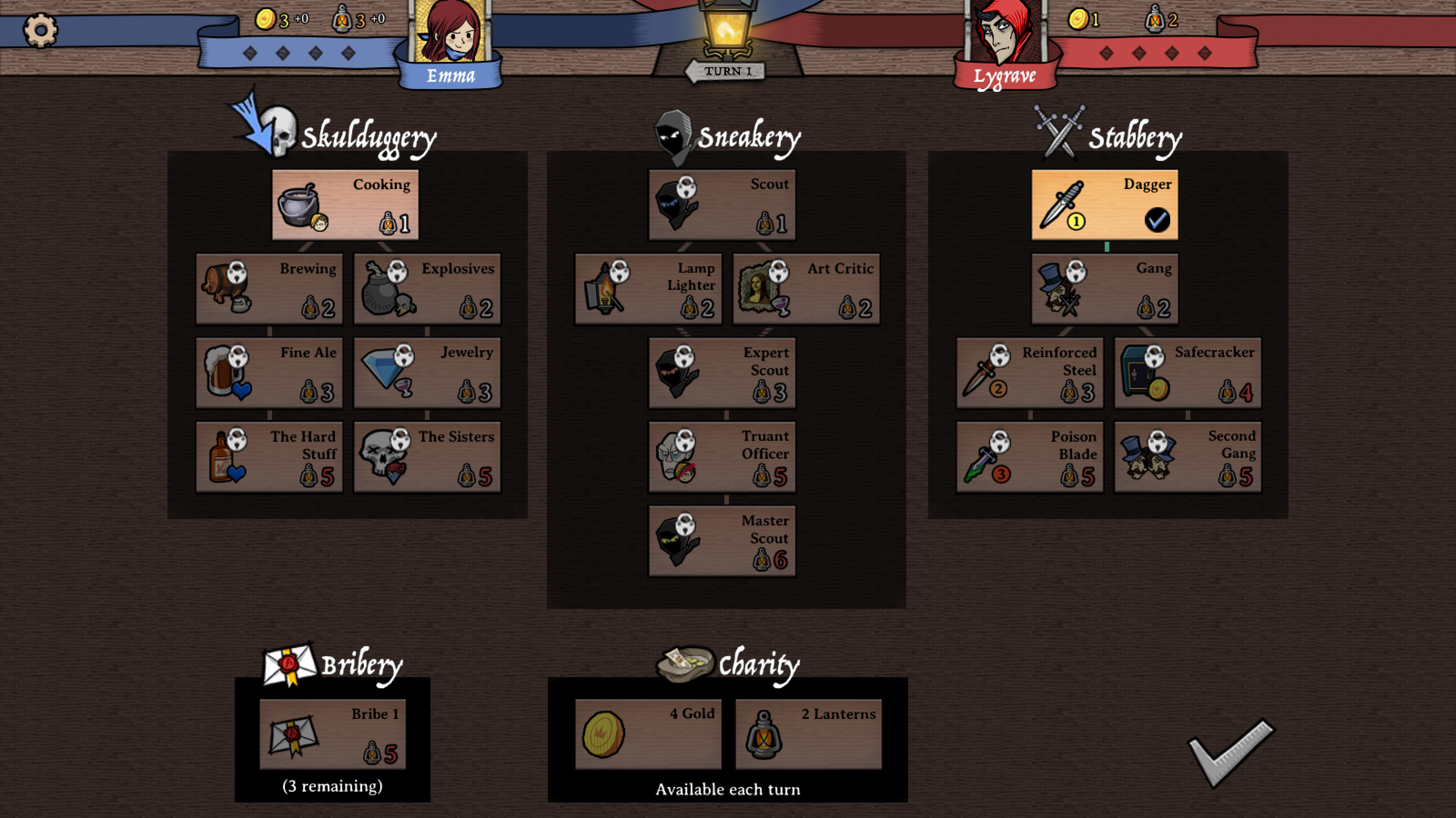 Each new match involves starting a new skill tree from scratch, opening up options for how you want to obtain your objectives. “Skullduggery” advances what allies you can obtain, and advances their abilities, “sneakery” improves your mobility options, and “stabbery” gives you more combat options and improves your strength.