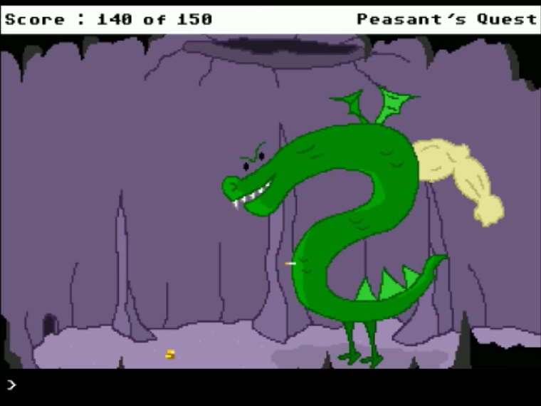 From the sort of people who brought you Trogdor and Litigation Jackson comes an invaluable piece of Web 1.0 pie in the style of a classic DOS adventure game. Peasant’s Quest puts you in the short pants of Rather Dashing, a local peasant who is out for revenge against the iconic dragon Trogdor for burninating his village. Modeled after the King’s Quest series of games and with tasteful nods to its laundry list of influences, Peasant’s Quest has you traverse the land of Peasantry in search of a proper disguise to convince the knight protecting the entrance to Trogdor’s lair that you are, in fact, a peasant. The game has fun retro graphics but is in the style of a text-based adventure, featuring lots of typing ‘LOOK’ and ‘TALK’ to any and all things on the screen, with a heaping helping of ‘GET’ thrown in for good measure. You’ll try to make friends with the Kerrek, attempt to raise a baby, make and lose some riches, and have a climactic final showdown with Ol’ Beefy Arm himself.