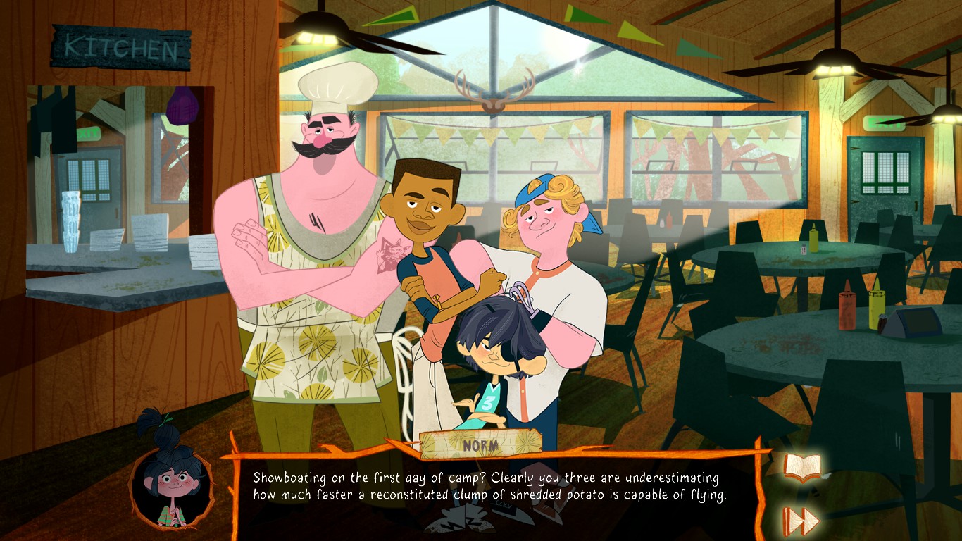 At times, many of these characters are firmly in caricature territory (like the nature-loving stoner head counselor, Todd), but the personalities at play are strong, distinct and entertaining. The writing is playful, and the camp setting is well-realized in the hand-drawn art. As Lil wades into the lake, her feet sink into the squishy bottom, a sensation which will be familiar to anyone who’s ever made the mistake of entering a camp swimming hole through any method other than cannonball. Similarly, a pleasant, shady dinginess helps the mess hall feel like many a mess hall where I slurped down red drink in in my youth. Strong writing and art direction paired with the premise of getting to spend a summer at this enticing camp had me excited to follow the game wherever it went.