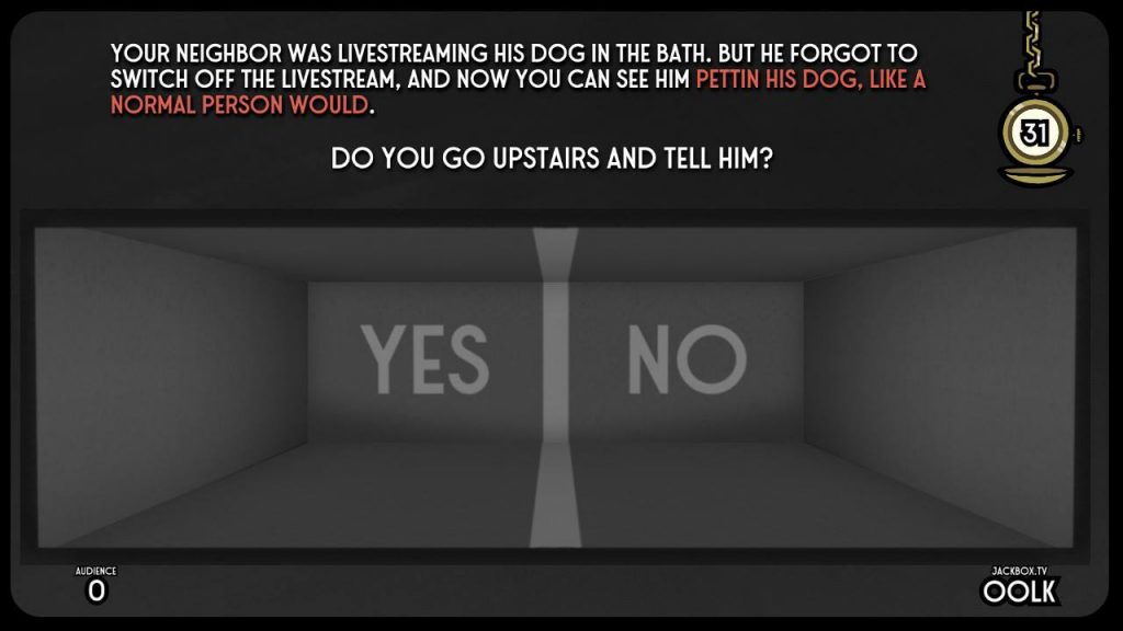 Most Jackbox games are essentially comedy competitions: The person with the funniest answers, quips, or drawings is the one who wins. While this is still a factor in “Split the Room,” having controversial scenarios is the real objective. Thus, the objective is not necessarily to have the room full of laughter, but to have it be full of heated debate, with bonus points given for the longer it takes for people to vote.