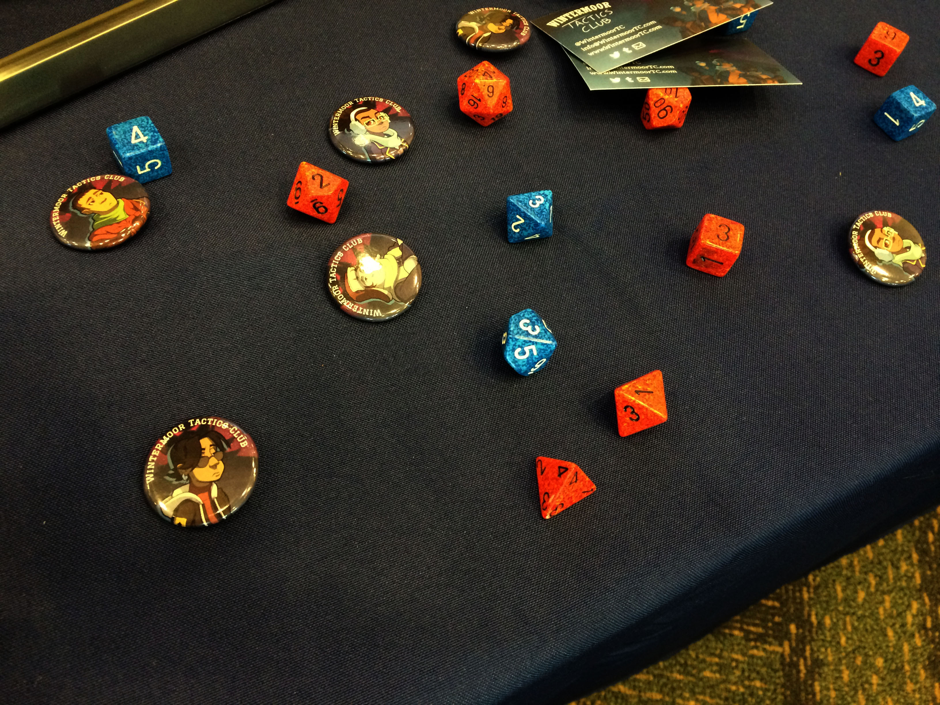The Indie Megabooth table for Wintermoor Tactics Club at GDC 2019 had business cards, promotional pins, and different types of dice spread out on its surface.