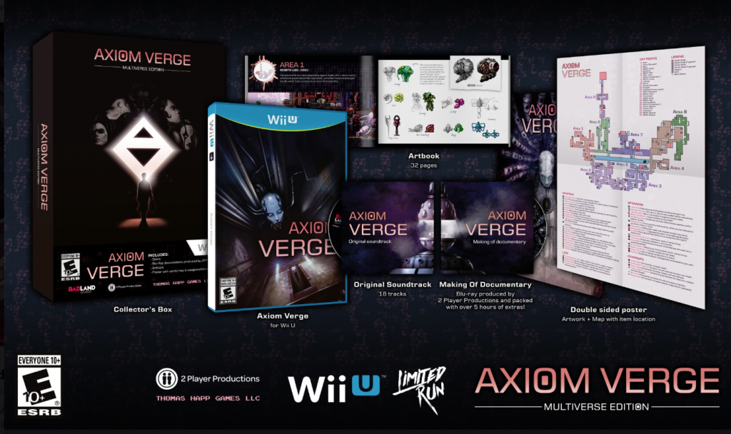 The physical Wii U edition of Axiom Verge is technically the same as the previously released “Multiverse Edition.” It includes a poster, soundtrack CD, art booklet, and making-of documentary. The original Wii U release was delayed when the developers ran into some troubles with their publisher.