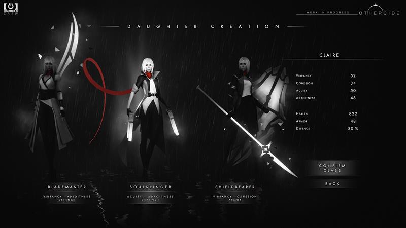In the GDC demo, daughters had three distinct classes: shield bearer (tanky DPS), blade master (DPS), and soul slinger (ranged DPS/support). None of these classes had any way to heal themselves or each other, and this is very much a design choice.
