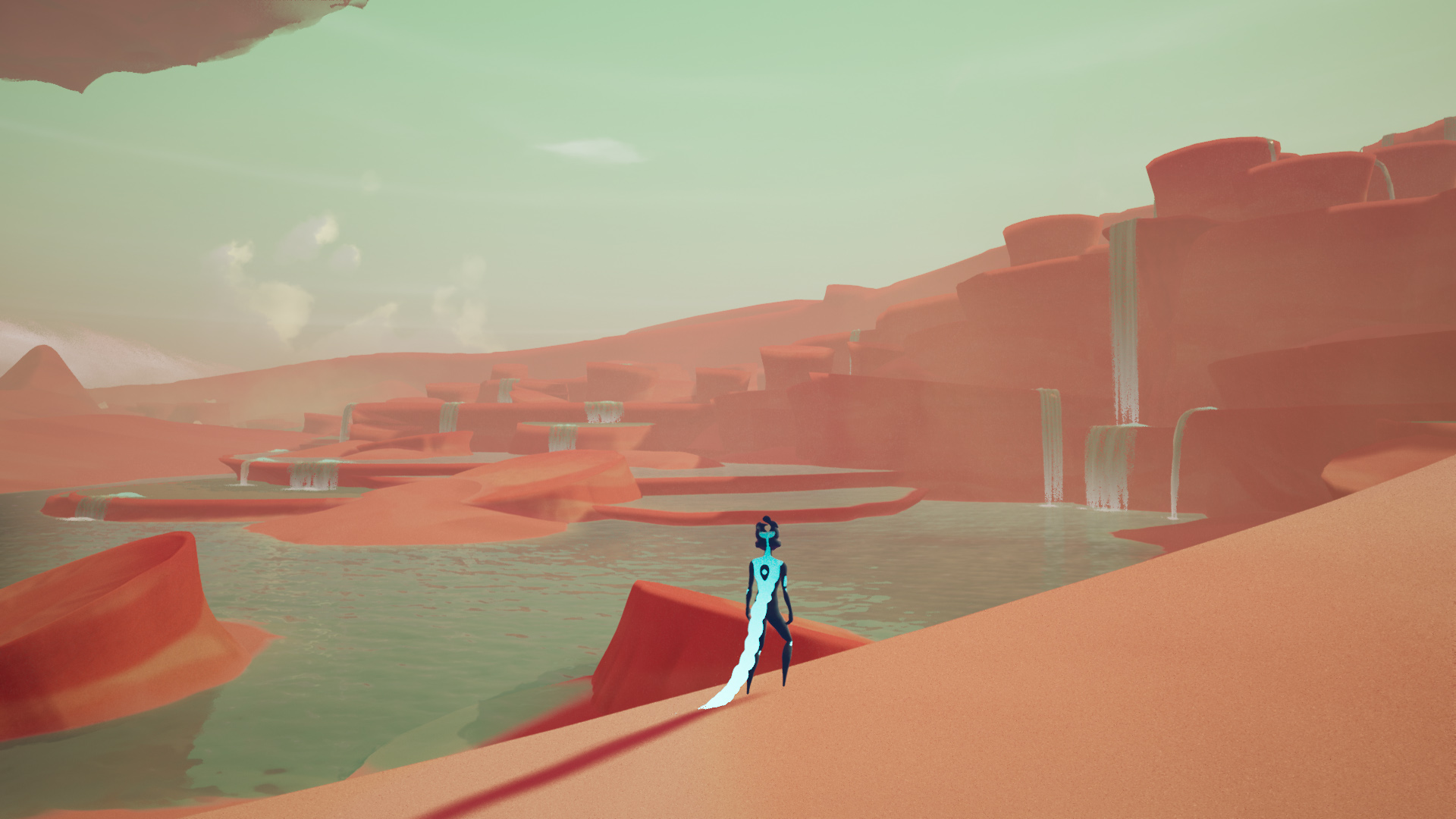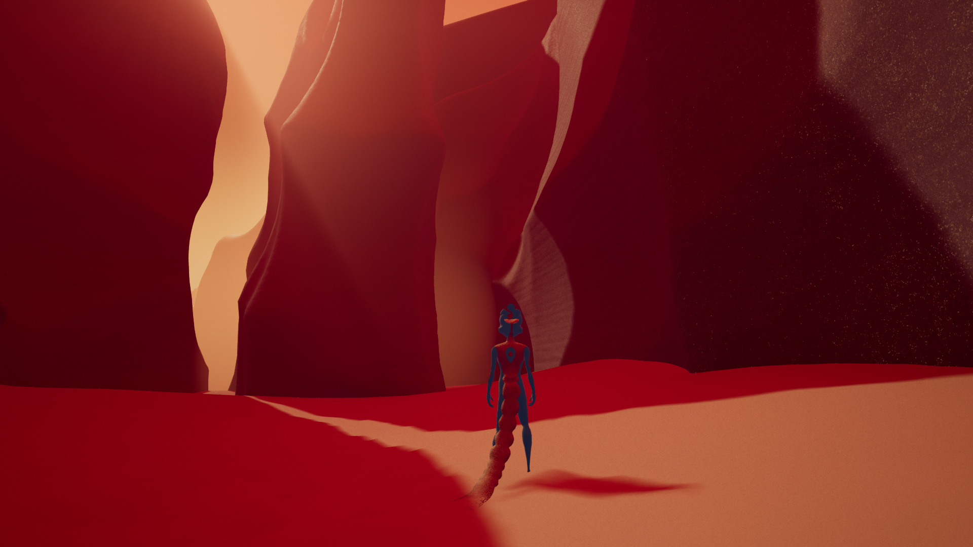With sandy environments, a tranquil tone, and a mysterious character wandering around, Areia feels reminiscent of a certain award-winning game from 2012. Raimbault does not beat around the bush and confirms that Journey was a source of inspiration. (Areia‘s growing tail even echoes Journey’s growing scarf.)