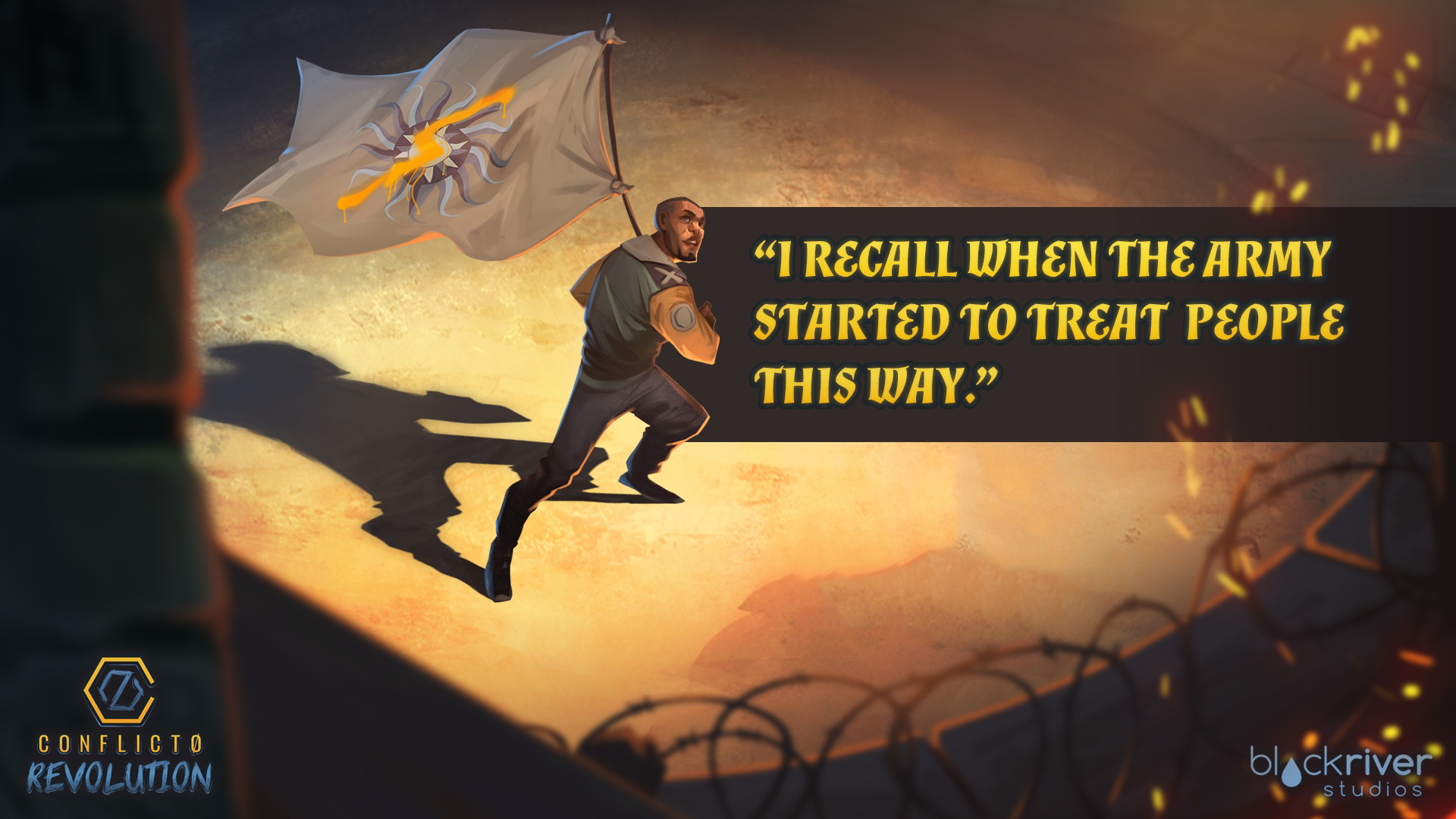 Conflict 0: Revolution revolves around an eponymous revolution triggered by government corruption. This event builds a wall that divides the rich from everyone else in the fictional land of Navaha.