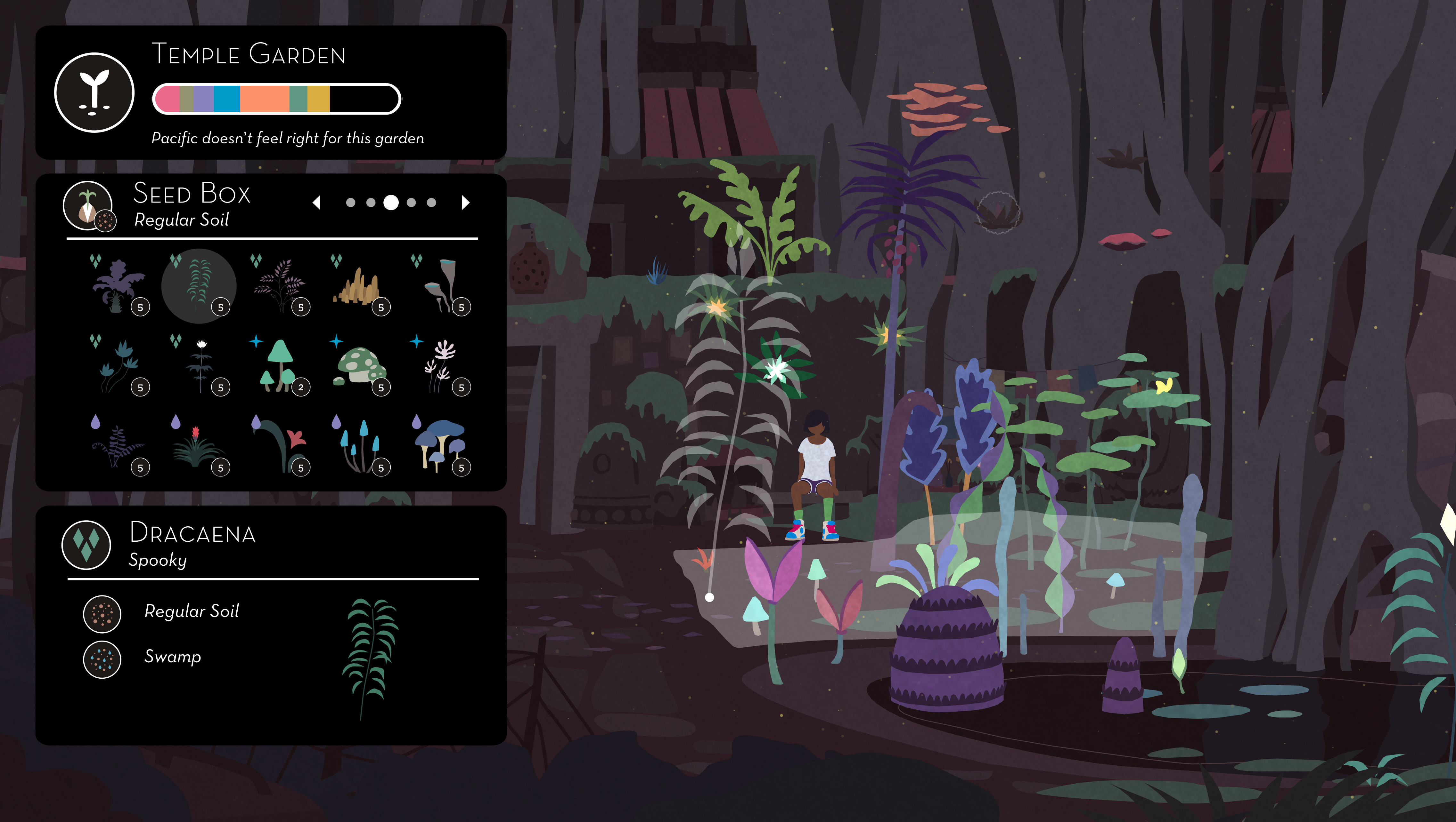 As for gameplay, despite being a narrative-driven game, one of the key features of the game is a piece of gameplay, and just like the narrative, it’s up to the player how deeply they want to engage with it. The magical musical gardens are at the heart of the puzzle of the game, but they’re also designed to be an engaging and delightful experience in their own right. There are scores of plants in the game you can harvest seeds from, different plants are suited to different growing environments and conditions, and they all have their own specific musical sound. So you’ll be composing magical musical gardens as part of the game.