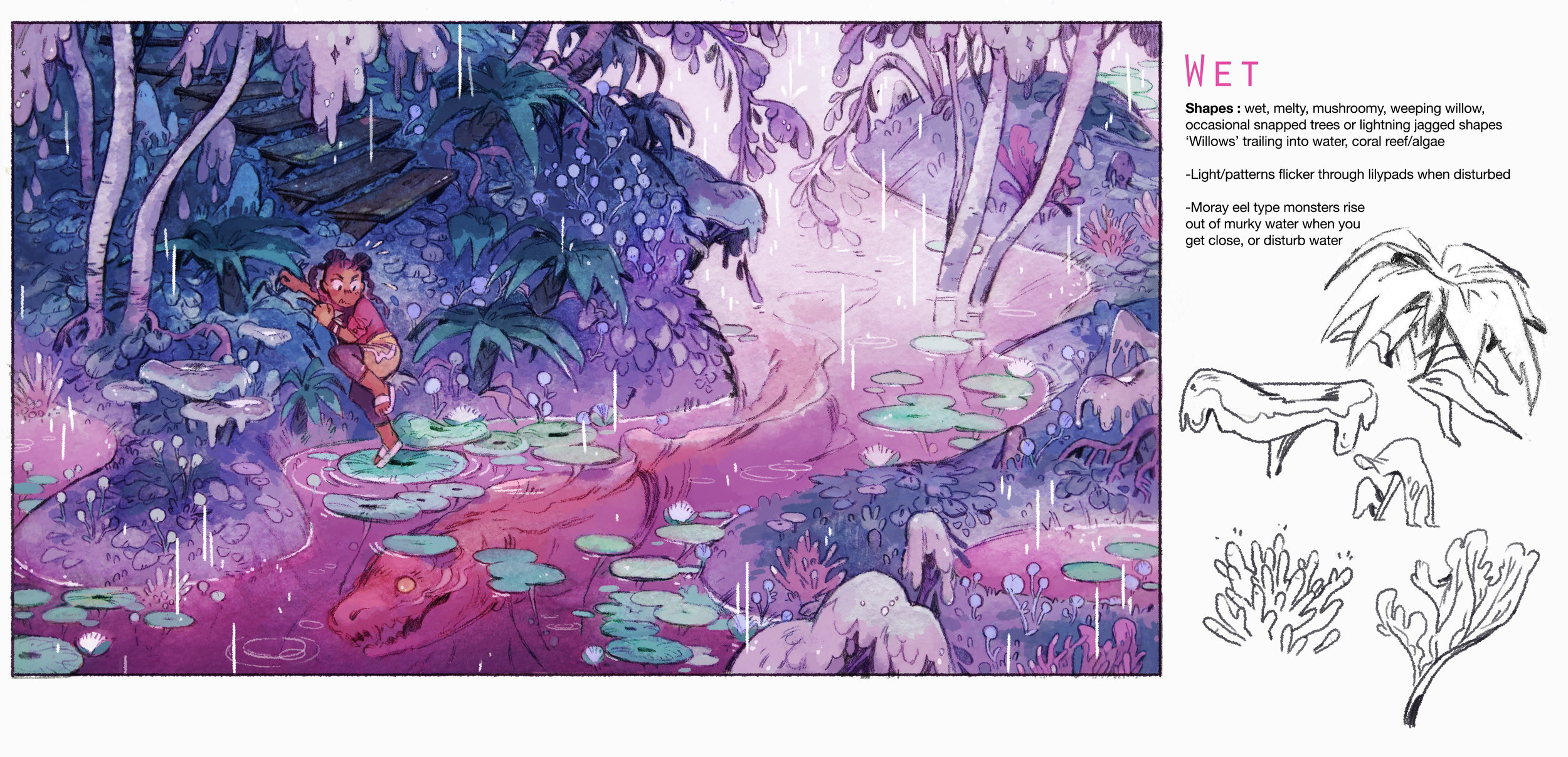 “Split between digital sketches and pencil sketches,” Webb says. Elaborating on this, she describes the next steps of her process as 60 percent traditionally done with watercolors. Then it’s 40 percent digitally crafted. Webb adds that she made a few pieces purely digital for purposes of color, though she still included pencil lines.